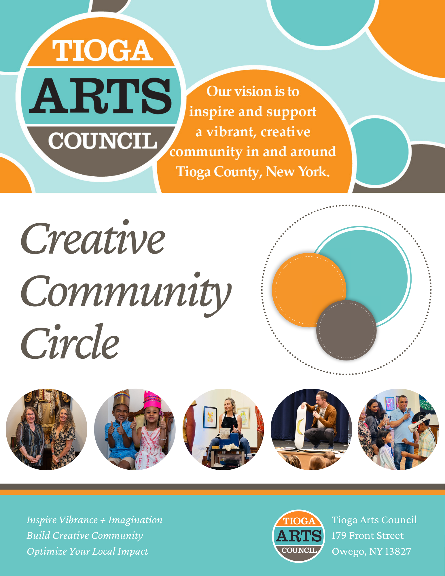 shaping Owego into a vibrant, creative community and arts destination in the Southern Tier. As the only countywide arts and culture nonprofit in Tioga , we are a leader in building creative community that believes in the area's creative vitality and that art is for everyone. When you join the Creativity Community Circle at Tioga Arts Council, you help bring exceptional and accessible cultural programming to every corner of Tioga County. Check out the levels and benefits below.